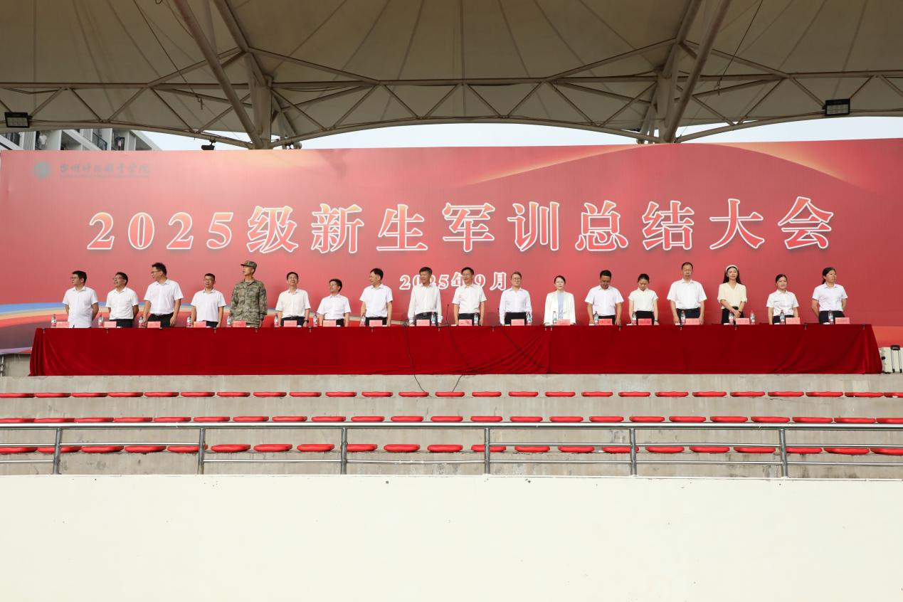 9月30日,我校举行2025级新生军训总结大会。校党政领导班子成员,空军路桥场站副站长、副团职干部张亮亮出席会议。各二级学院党政班子成员,各职能部门主要负责人,全体辅导员,2025级班主任,全体新生,教官参会。会议由党委副书记金松主持。