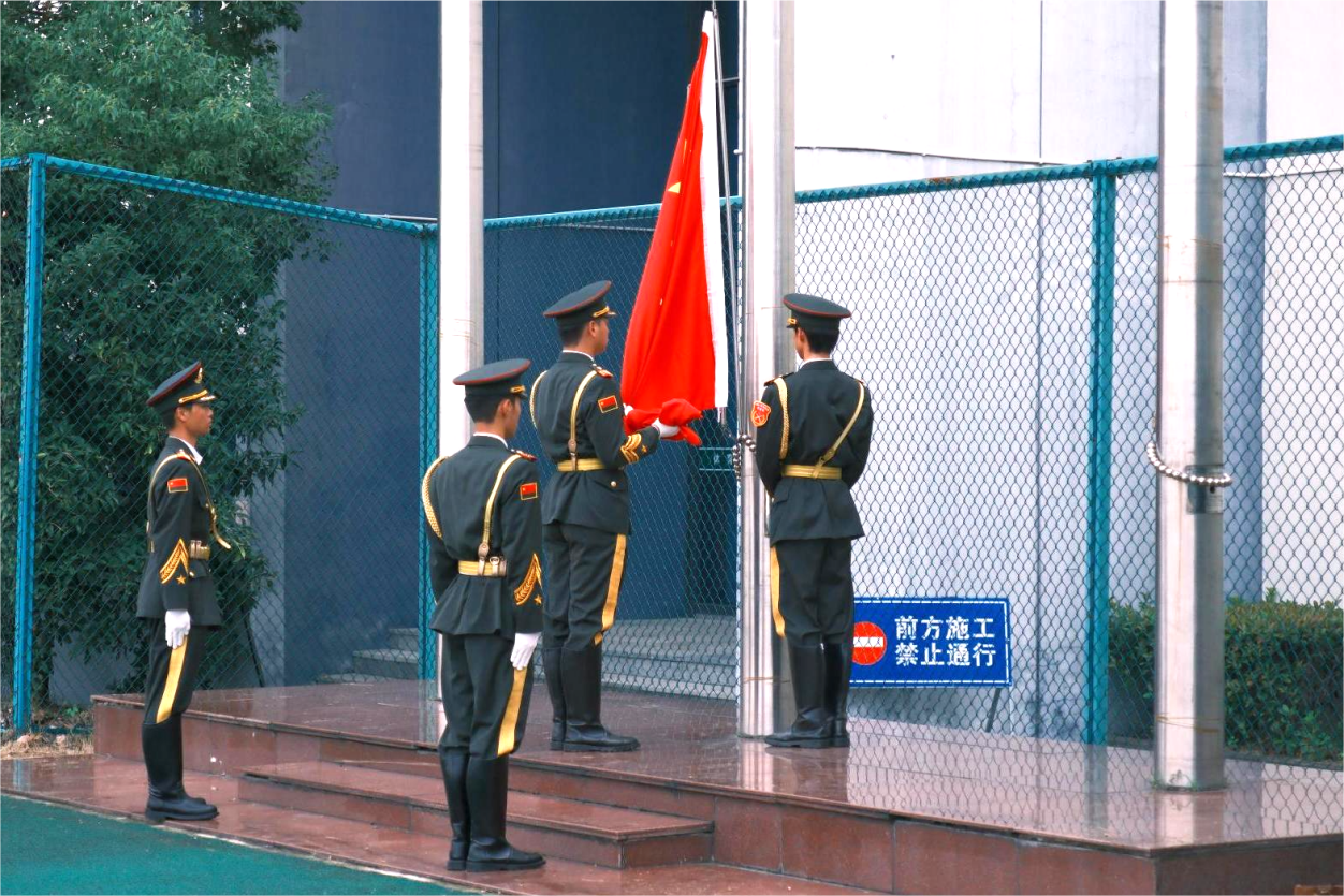 国旗护卫队迈着整齐的步伐,护送着五星红旗前往升旗台。在雄壮的国歌声中,五星红旗冉冉升起。